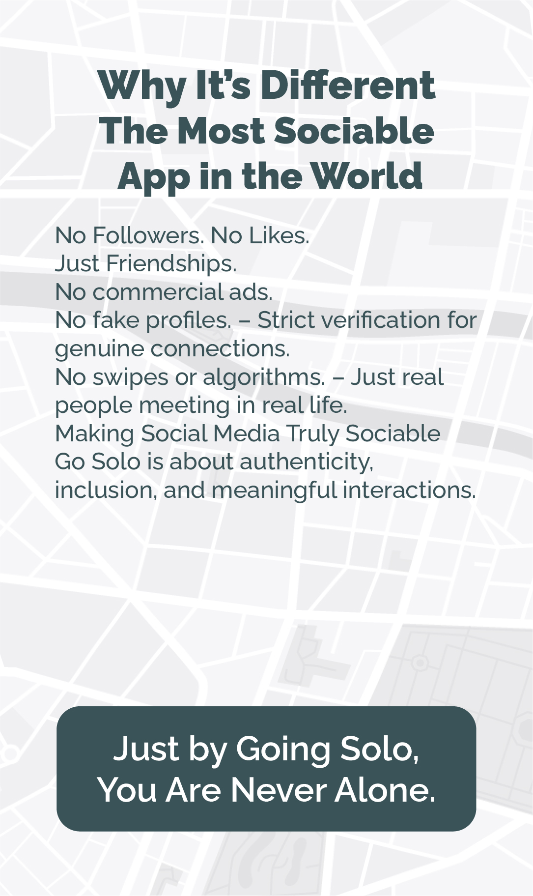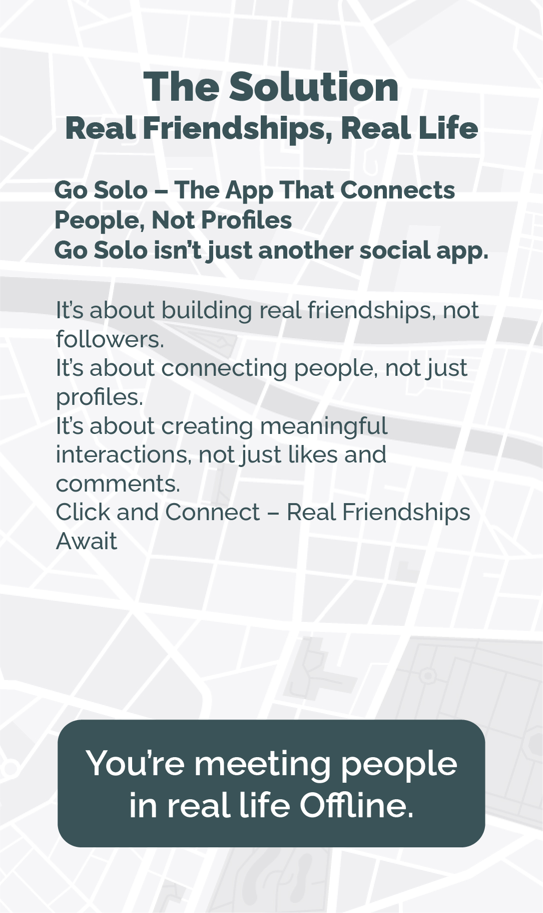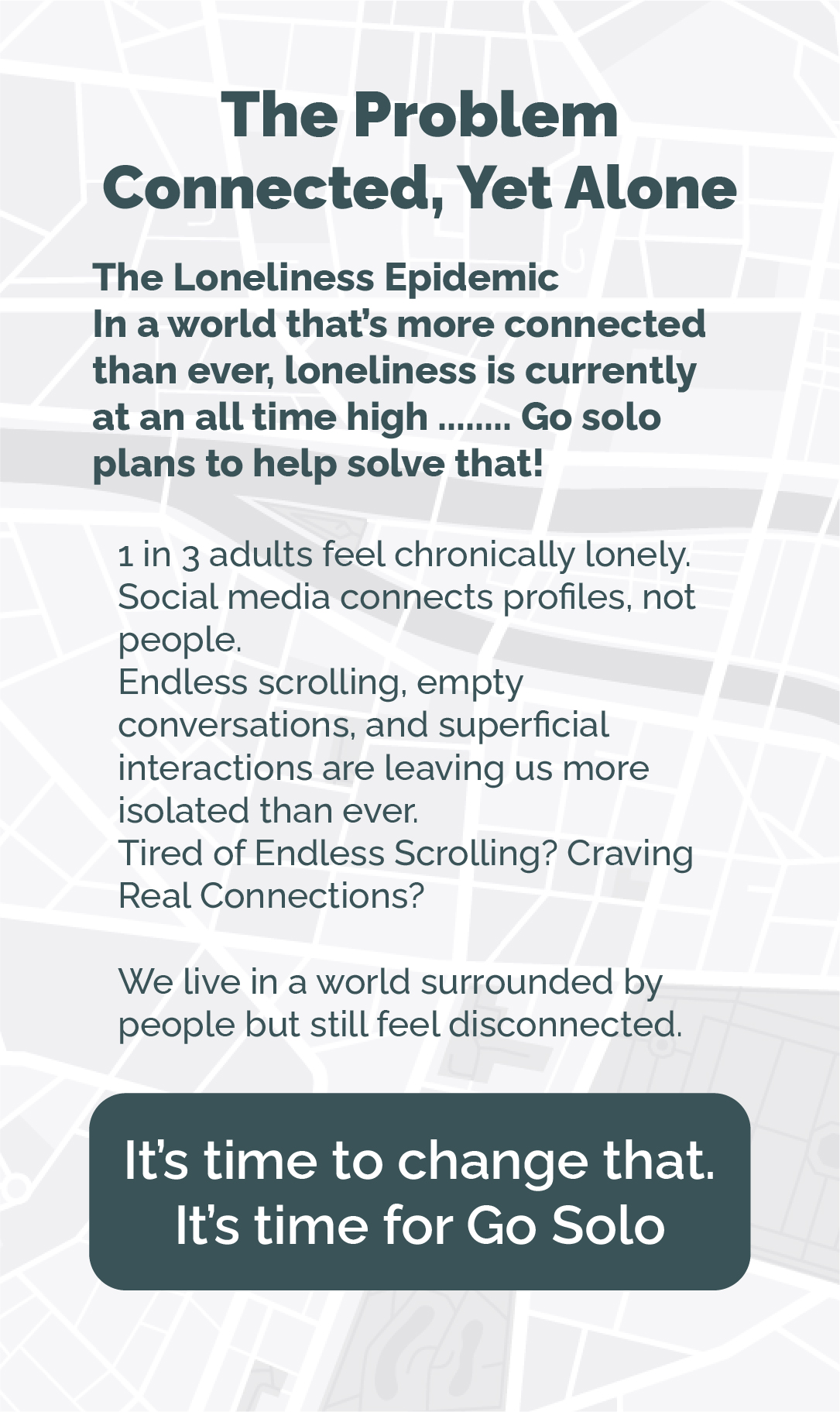 Don't do it alone, whether it's grabbing a coffee, exploring a new city or just taking a walk, Go Solo turns solo moments into unforgettable shared experiences. Click and connect ~ Real Friendships, Real Life.